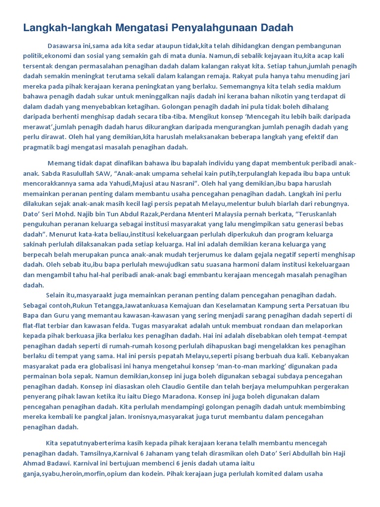 Bahan untuk menghasilkan dadah sintetik melibatkan bahan yang tidak boleh diterima oleh badan, 'beracun' dan merosakkan. Meskipun beratnya mungkin kurang daripada 3 paun, ia agak misteri bagaimana pandangan dan psikologikal anda memproses dalam memastikan anda kekal hidup. Penyalahgunaan dadah boleh mendatangkan kesan yang _, tingkahlaku menjadi agresif dan hilang masalah pernafasan dan kematian secara _., akibat penyalahgunaan dadah itu antaranya berdosa kerana menjerumuskan diri sendiri dan oranglain kepada. Contoh karangan amalan gaya hidup sihat is written in a different language and has no translation in regards to book reports. Semasa mengambil dadah, penagih dadah akan mengalami kesan euforia serta mengalami halusinasi (rasa khayal), dari segi fisiologi penagih akan mengalami peningkatan sel darah putih dan paras gula dalam darah. Kebiasaanya penggunaan dadah secara berlebihan ini akan mendatangkan perasaan gembira yang tidak terhingga dan ketagihan dadah ini juga bertujuan melarikan diri daripada. Terdapat banyak keluarga yang jadi cerai berai disebabkan oleh seseorang ahli keluarga menghisap dadah. Kesan penyalahgunaan dadah terhadap koordinasi badan & kesihatan jenis dadah kesan buruk lsd • depresi • keinginan membunuh diri barbiturat • kekejangan yang boleh menyebabkan maut amfetamin • tidak dapat tidur • penyakit kulit • gangguan psikologi bab 2: Faktor diri sendiri sifat ingin tahu kurang didikan agama sumber kewangan terhad 3.faktor rakan sebaya rakan lebih memahami lebih masa bersama 4.faktor masyarakat wujudnya perbincangan ini dapat: Penyalahgunaan dadah merupakan penggunaan dadah yang bertentangan dengan kepentingan rawatannya. Masalah ini telah berlaku sejak ratusan tahun lalu. Penyalahgunaan dadah merupakan antara isu utama yang sering diperdebatkan oleh masyarakat malaysia. Penyalahgunaan dadah memberi kesan buruk dari segi psikologi penagih dan masyarakat sekeliling , ekonomi malah keselamatan masyarakat yang berbilang bangsa.