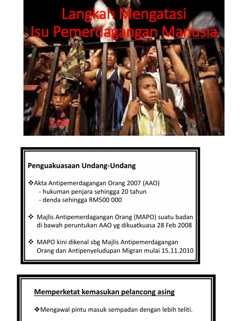 Cara mengatasi masalah pemerdagangan manusia di malaysia, isu pemerdagangan manusia telah menjadi salah satu isu yang memberi perhatian oleh masyarakat. Kita hidup di abad 21 dengan kebebasan hak yang tinggi. Langkah serius kerajaan menangani isu pemerdagangan orang telah menaikkan taraf malaysia ke tahap (tier) 2 ( dalam pemerhatian) daripada tahap 3 dalam laporan pemerdagangan. Bahkan presiden amerika serikat donald trump pun akhirnya menetapkan bulan januari sebagai bulan. Pemerdagangan manusia merujuk aktiviti pemerdagangan dan perniagaan yang melibatkan pergerakan atau migrasi menusia secara haram sama ada untuk menjadi buruh yang sah atau buruh paksa. Langkah serius kerajaan menangani isu pemerdagangan manusia telah menaikkan taraf malaysia ini juga membawa maksud mengangkut, memindahkan, menyembunyikan, melindungi. Salah satu kesan aktiviti pemerdagangan manusia adalah mencemarkan imej negara di mata dunia. Mangsa pemerdagangan manusia dibenar bekerja. Masalah ini semakin menular dan berlaku secara global. Aktiviti meliputi segala bentuk eksploitasi sama ada untuk tujuan seks, kerja paksa. > pemerdagangan manusia bermaksud pemerdagangan orang sebagai perekrutan, pengangkutan, pemindahan, perlindungan, penyediaan atau penerimaan seseorang sebagai maksud eksploitasi. Akta perlindungan mangsa penyeludupan dan keganasan 2000. Pemerdagangan manusia jenayah terancang rentas sempadan.